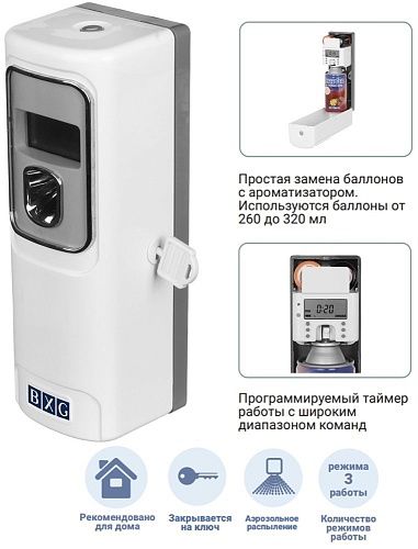 BXG-AR-6006 - программируемый автоматический освежитель воздуха. Это современный, стильный и надежный прибор, предназначенный для поддержания приятного аромата в помещениях. Прибор очень просто программируется, что позволяет настроить его в зависимости от интенсивности использования помещения. Может монтироваться на стену, а также может устанавливаться на любые ровные поверхности (полки, шкафы и проч.). Освежитель работает от батареек, что позволяет устанавливать его в любом удобном месте. Корпус освежителя изготовлен из ударопрочного пластика, механизм защищён от повреждений и прост в эксплуатации. Отлично подходит для удаления неприятных запахов в туалетных и ванных комнатах, в жилых помещениях, офисах, ресторанах, залах для курения, магазинах, спортивных залах.