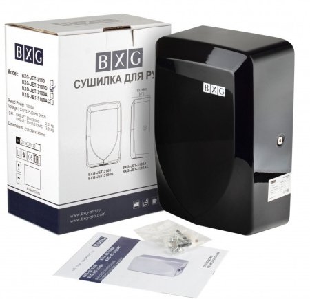 BXG-JET-3100D -  стильная черная высокоскоростная сушилка для рук с ультрафиолетовым обеззараживанием. Корпус данной сушилки выполнен из ударопрочного пластика. Предназначена для использования в местах со средней и высокой проходимостью, а также в помещениях с повышенными требованиями к безопасности и гигиене. Мотор нового поколения обеспечивает быструю  сушку рук (5-7 секунд) при минимальной мощности. При своих выдающихся характеристиках, данная сушилки работает достаточно тихо.